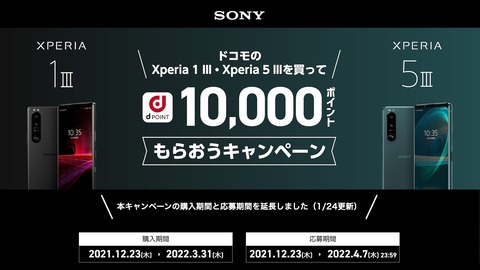 NTTドコモは24日、同社が販売するフラッグシップスマートフォン(スマホ)「Xperia 1 III SO-51B」および「Xperia 5 III SO-53B」(ともにソニー製)を期間中に購入して応募した人を対象に「ドコモのXperia 1 III・Xperia 5 IIIを買って10,000ポイントもらおうキャンペーン」(ソニーマーケティング主催)を延長するとお知らせしています。