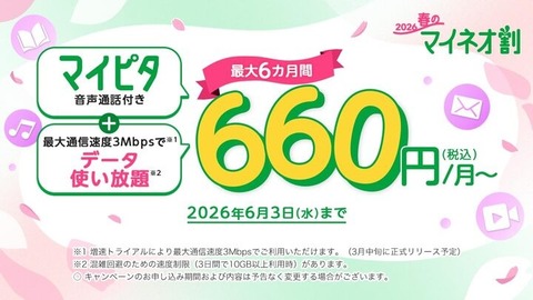 料金(金額はすべて税込)はパケット放題 Plusから変更はなく、料金プラン「マイピタ」のデュアルタイプ(音声通話対応)の3GB・7GBコースおよびシングルタイプ(データ通信のみ)の7GBコースの場合には月額385円、15GB・30GB・50GBコースの場合には無料となります。また現在「2026春のマイネオ割」キャンペーンが実施されており、パケット放題 Plusが最大9カ月間に渡って毎月最大275円割引となっていますが、パケット放題 3Mbpsに変更後も同様となるということです。