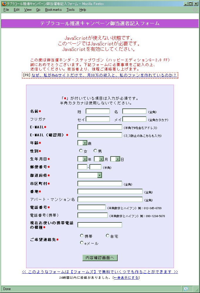 さらに追記:ちなみにこの情報を掲載したときはあまり詳しく書かなかったけど、上記住所入力ページのソースを見たところ、JavaとかJavaScriptを入れてアクセスしても多分大丈夫な感じですた。入力フォームに情報を入れて、それからボタンを押して情報を確認して送信、という作りになってたみたいで、トップページの能書きを読む限りでは、送信フォームのところでメールアドレスはいきなりソースに書かれていたりするってなことは無さそうですね。