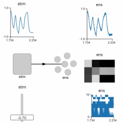 Nengoの使い方②:信号の演算と変換 2020年08月04日 前回は入力信号をそのまま出力するネットワークだった。これだけだと、信号を伝えることしかできない。今回は演算や信号変換を行ってみて、信号処理が出来ることを確かめる。加算加算は簡単で、nengo.Connectionを2回使って繋げるだけで出来る。下のコードではaとbの2つが加 ... もっと読む