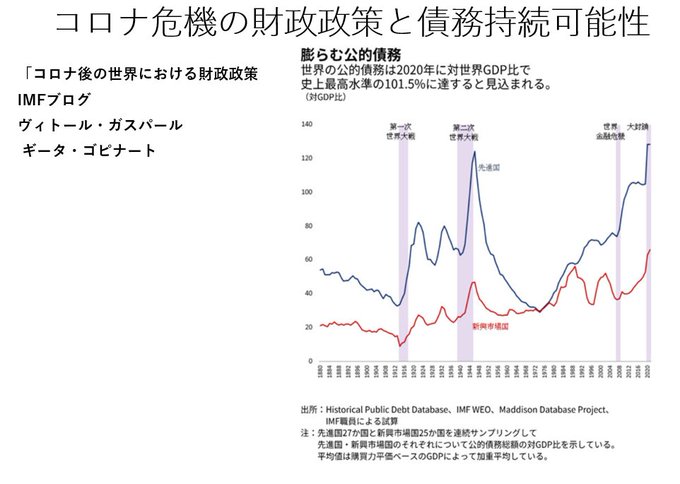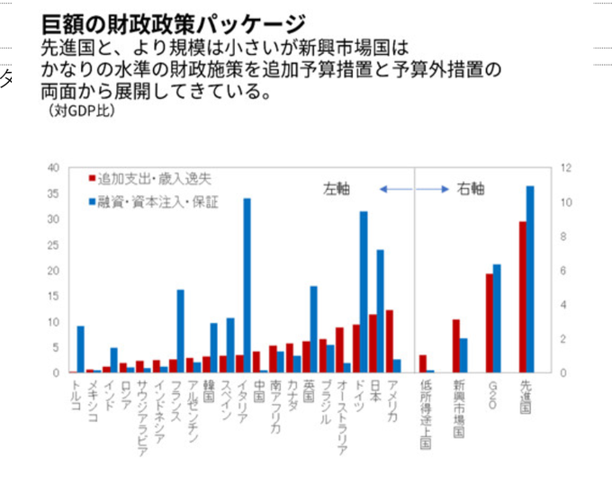 どんどん財政政策すべき、とかいうと「もう財政危機が起きるか心配」という人がわりといる。テレビの見過ぎか財務省のことを考え過ぎだろう。かの財政規律では悪名高いIMFでさえ、次のように各国の新型コロナ危機対策をまとめ、ぜんぜん財政心配ないといっている。三枚のパワポにまとめたのでご参照を。