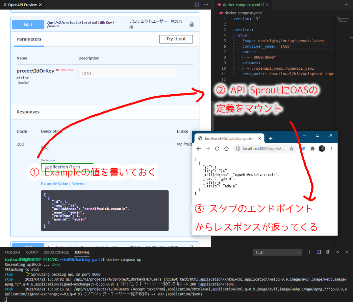 OpenAPI generatorには各種スタブサーバー用のジェネレーターが用意されています。 これによりサーバー側の実装が進んでいない状態でも、OASの定義にexampleを書いておけばそのレスポンスを使ってフロント側の実装を進めたり、デモ画面を作成したりすることが可能になります。 フロントエンドエンジニアはexampleだけでもいじれるようになっておけば、様々なデザインパターンを想定したデータを作って開発を進めることができます。