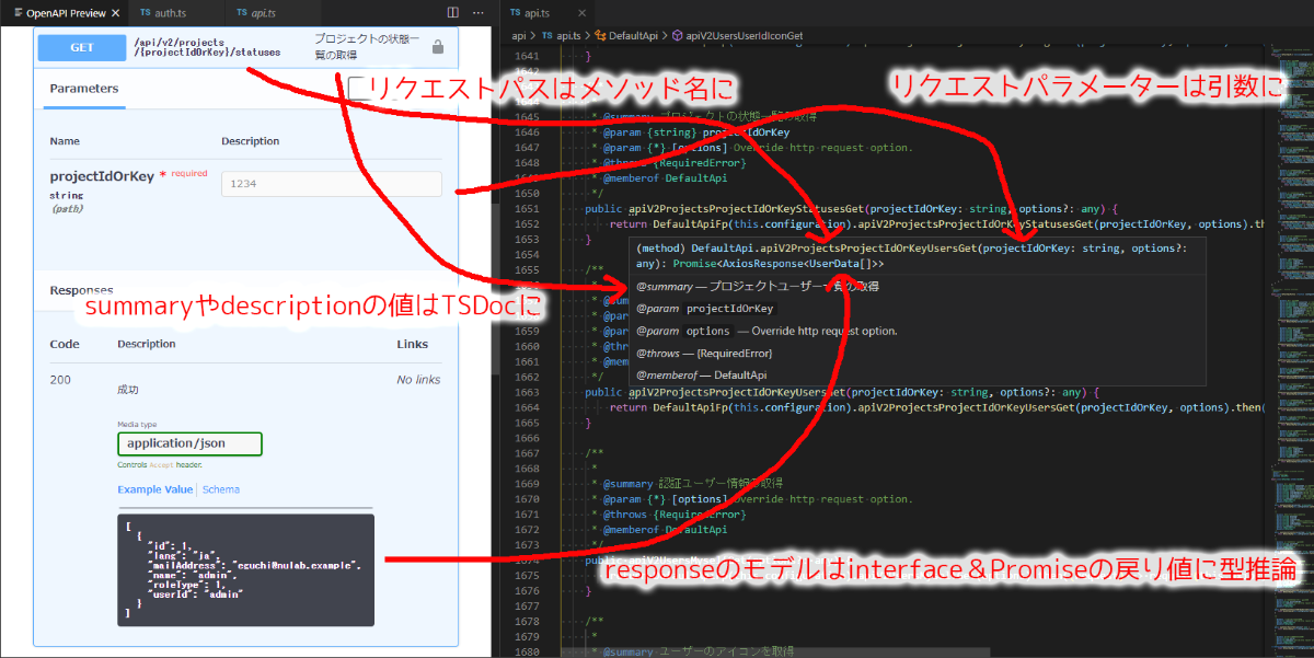 この生成されたInterfaceはOASのdescriptionがTSDocの書式で埋め込まれていますので、型をきちんと保ち続けていればマウスホバーするだけでIDEがdescriptionの内容を表示してくれるようになります。このため実装作業者はTSのコードとAPI仕様書やAPIの実際のレスポンスの画面とを行ったり来たりする頻度を大幅に減らすことができます。