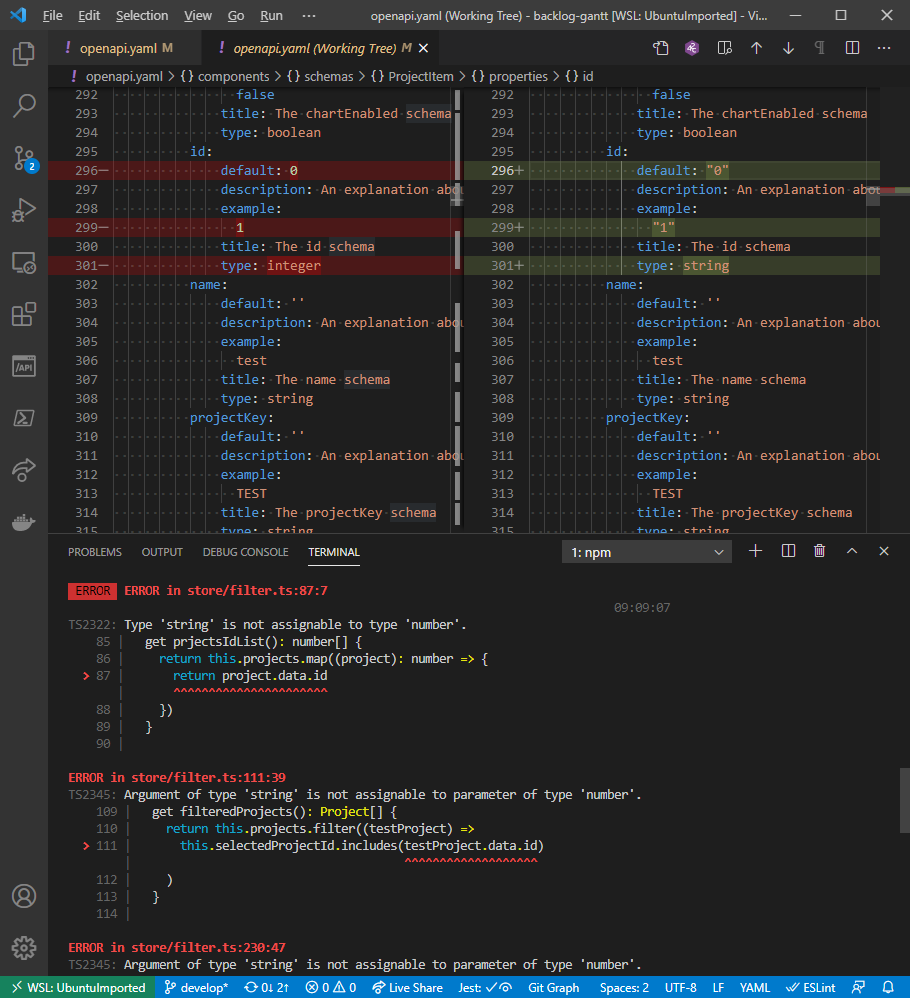 上記の例は、IDはintegerで来ると思って実装していたが実はstringが来ることが分かったのでスキーマを変更したケースです。定義ファイルの該当箇所を変更してジェネレーターでAPIクライアントを生成しなおしてから再度型検査を行ったことで、型が不一致になった個所が画面下のターミナルに羅列されています。