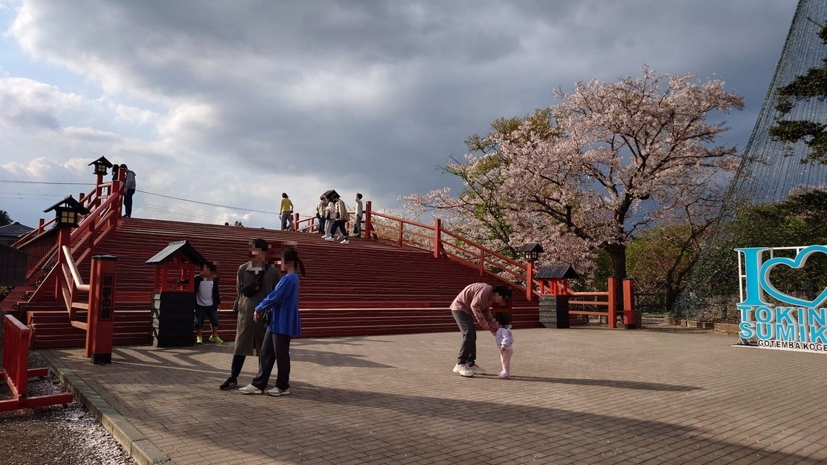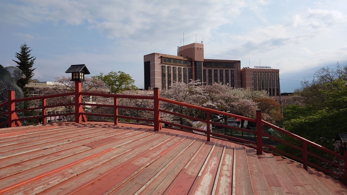 太鼓橋の上からの眺めをしばし堪能。赤い橋って、何とも言えない風情がありますね。