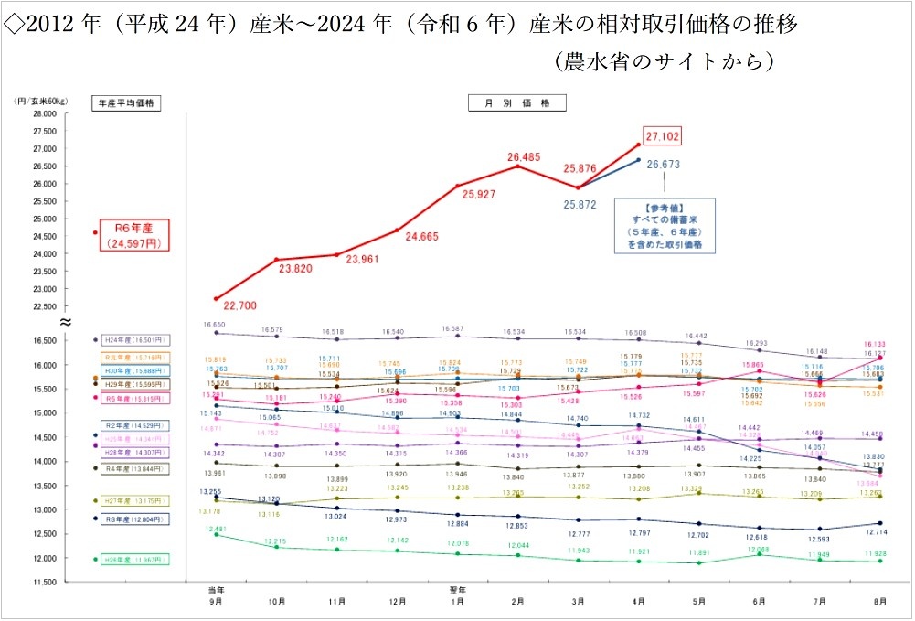 次のグラフは、2012年(平成24年)産米から2024年(令和6年)産米の相対取引価格の推移を示している。これを見れば、2023年(令和5年)産米までは玄米60キロ当たり1万2,000円から1万6,000円前後で推移しており、年間を通して安定していたことが分かる。2024年産米だけが9月以降、異様な形で高騰したことがよりハッキリと見て取れる。