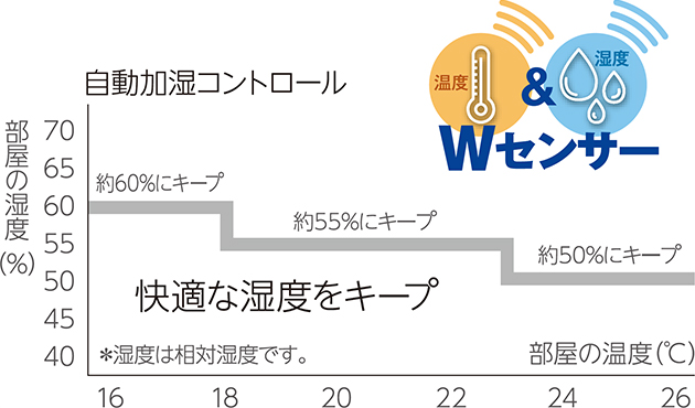 この内自動モードは部屋の温度に合わせて以下の画像の通り湿度を自動調節するようになっています(画像は製品ページより引用)。