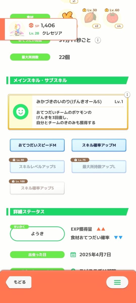 どっちの子を育てるか困る。育成が楽なのは①の子だが、せいかく補正を考えれば②の子が優秀だ。食材も第3食材の差で②の子が優勢。ただし、Lv.50まで育てないとスキル確率Mが解放されないので②の子は使いづらい。手持ちのアメではLv.50にならないんだよな。