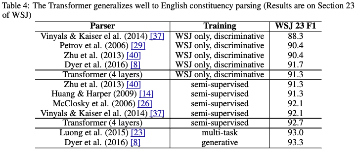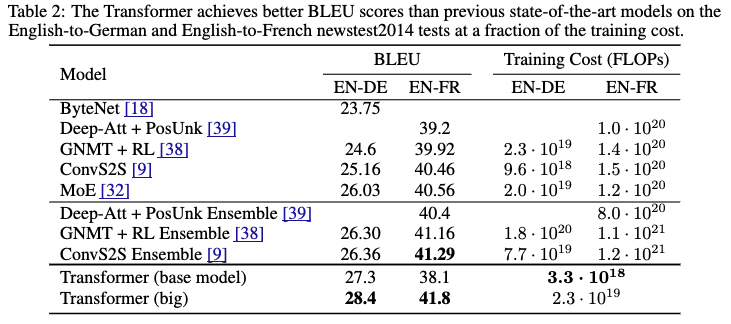 - Trandformer (base)でも英語-ドイツ語翻訳タスクでは既存モデルを上回った