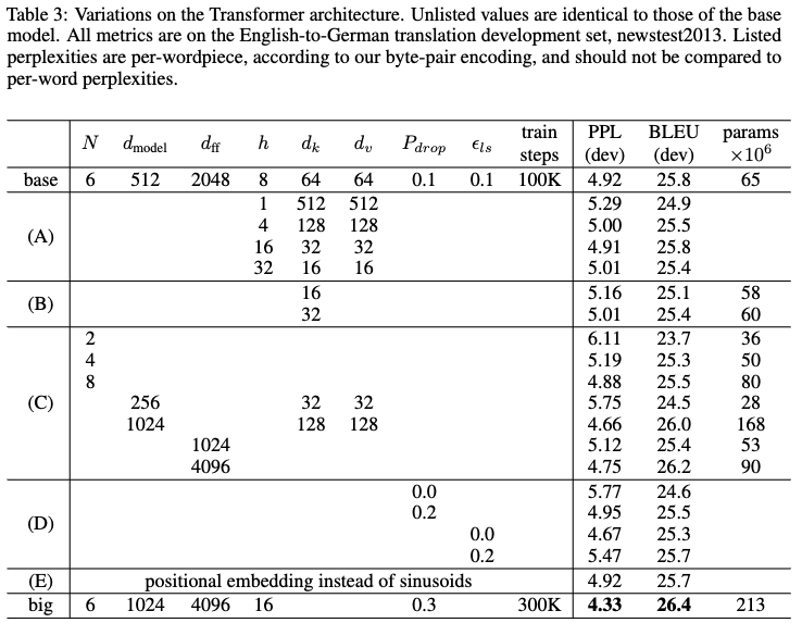 - (E): Positional encodingをlearned positional embeddingにしても、結果はほぼ変わらなかった