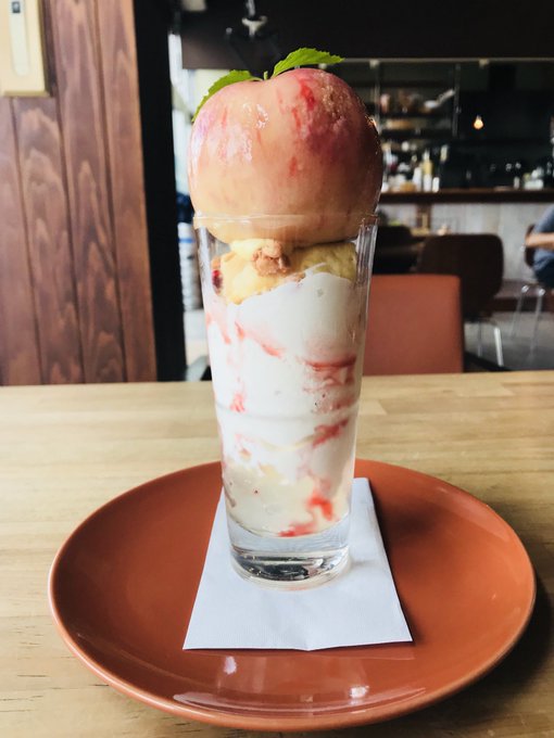 爽やかな桃のジュレ、濃厚な北海道ソフトクリーム、そしててっぺんに桃の果実が丸ごと!ナイフが添えられているので自分で好きなようにカットしながら食べ進めます。