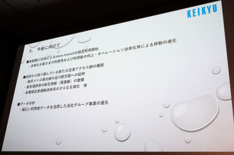 京急からは、90年代の独自SFカード「ルトランカード」の失敗を教訓としてグローバル標準のクレカ乗車の導入にいち早く取り組んできたことや、羽田空港に乗り入れている関係から、外国人を中心にクレカ乗車が大きく伸びていることが紹介された。首都圏の相互利用への期待は高く、東京メトロが品川駅に接続する南北線延伸計画などで羽田空港へのアクセスは複雑化すると指摘、周辺路線と連携を深めていく方針が語られている。