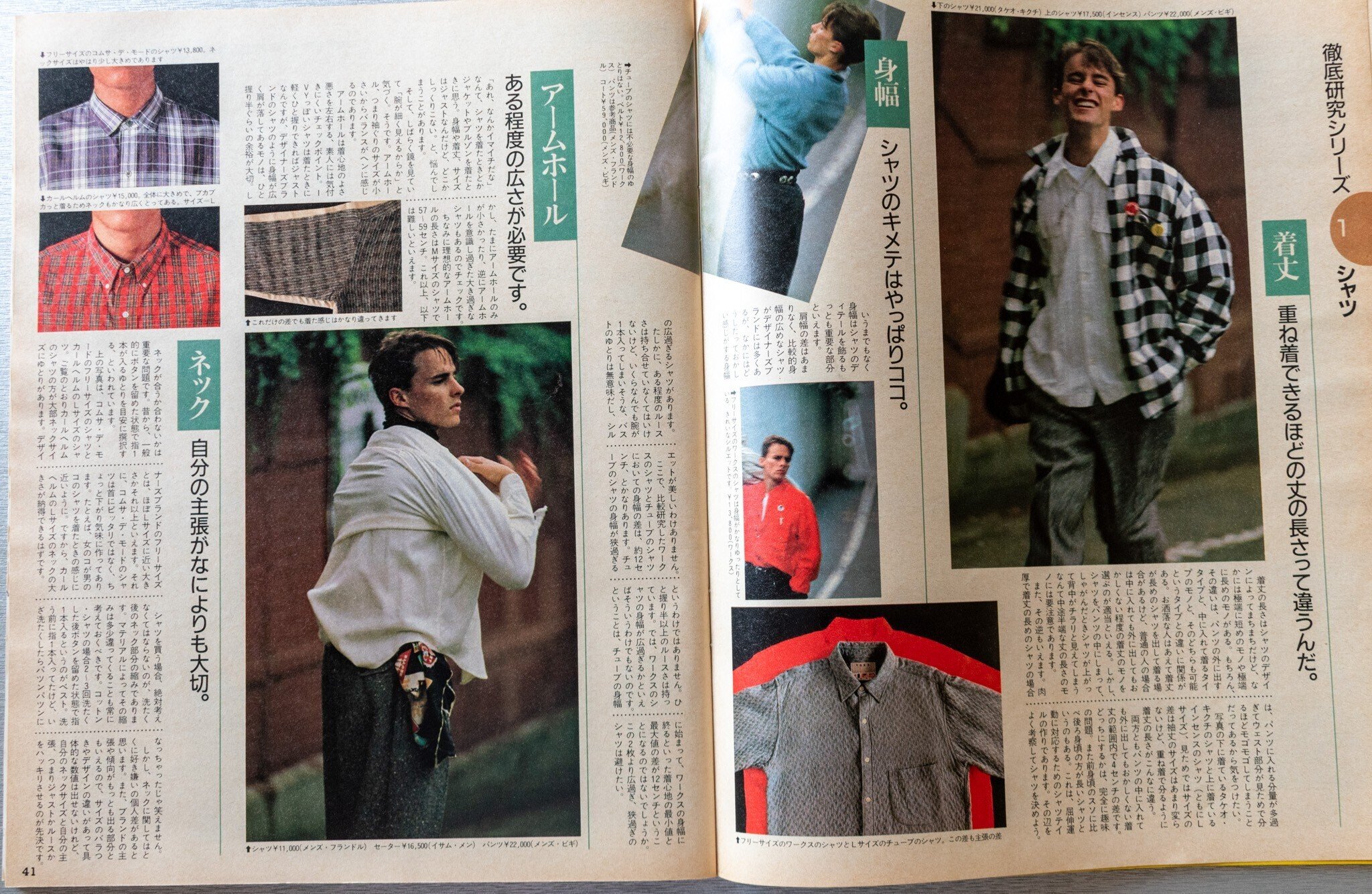次の特集は「徹底研究シリーズ」。最初はシャツ。当たり前の話ですが、同じMサイズでもブランドによってサイズが全然違う、という内容です。