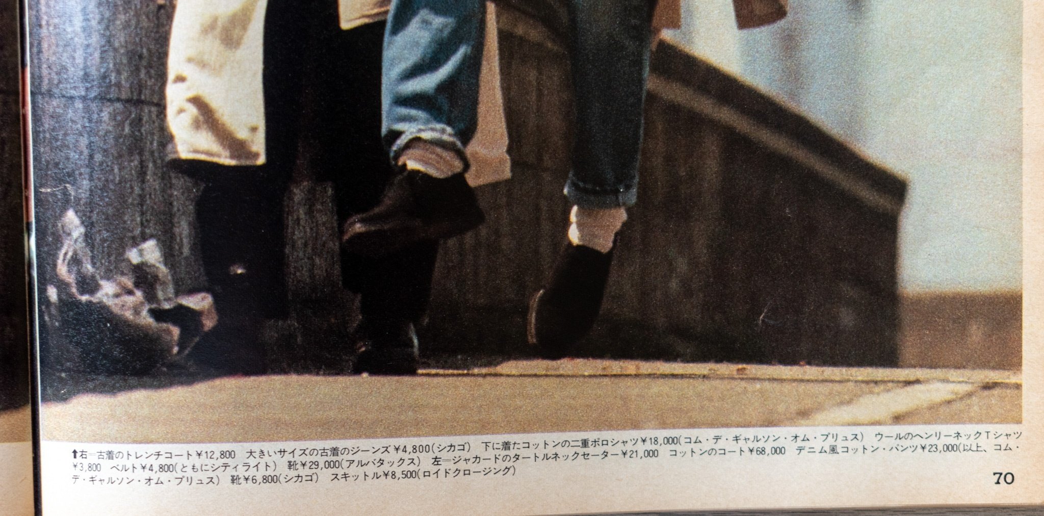 右のジャンプしている彼は、トレンチコート、ジーパン共に古着。今も原宿や下北沢に店を構える老舗、シカゴの商品です。先程の特集と同じく、コムデギャルソンも普通の古着と合わせると、その魅力が更に増すんですね。
