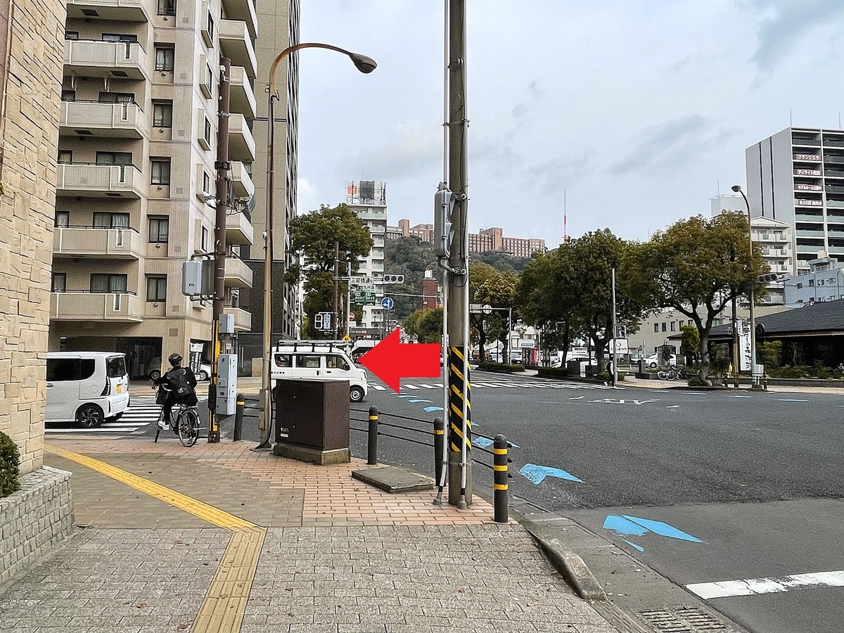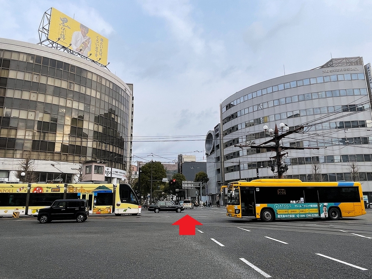 霧島温泉さんへは、鹿児島市電 高見馬場電停で下車し、高見馬場交差点を下の写真の方向に渡り、三宮橋通りを進みます。