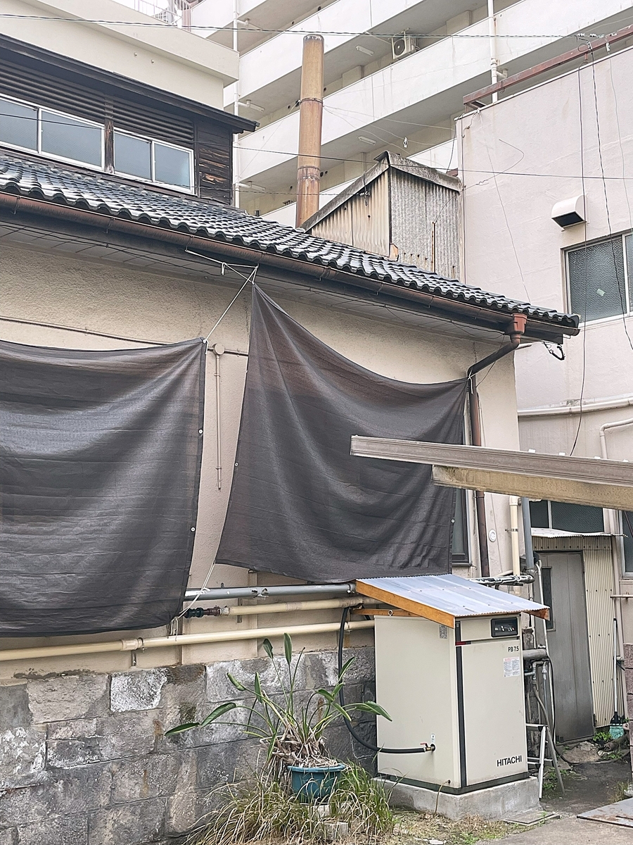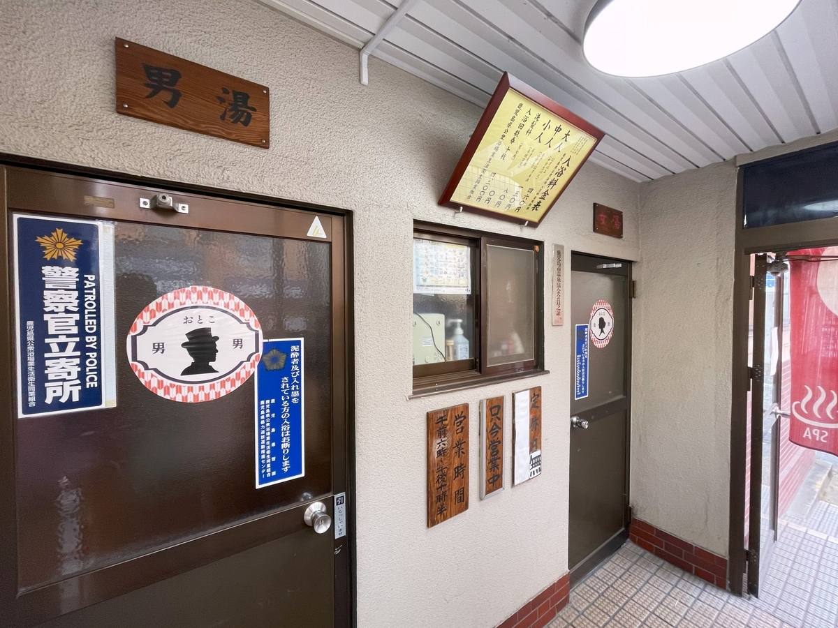 鹿児島銭湯は、ほとんど温泉銭湯で源泉が高温泉(湧出時42℃以上の温泉)の為、沸かし直す必要がなく、ボイラーや煙突が無い銭湯が多いように見受けましたが、コチラは高温泉の中でも45.8℃とボコボコ沸くというほどの高温ではない為、季節によっては沸かして湯温調節もされるようで、建屋の横からは煙突も見る事が出来ます。