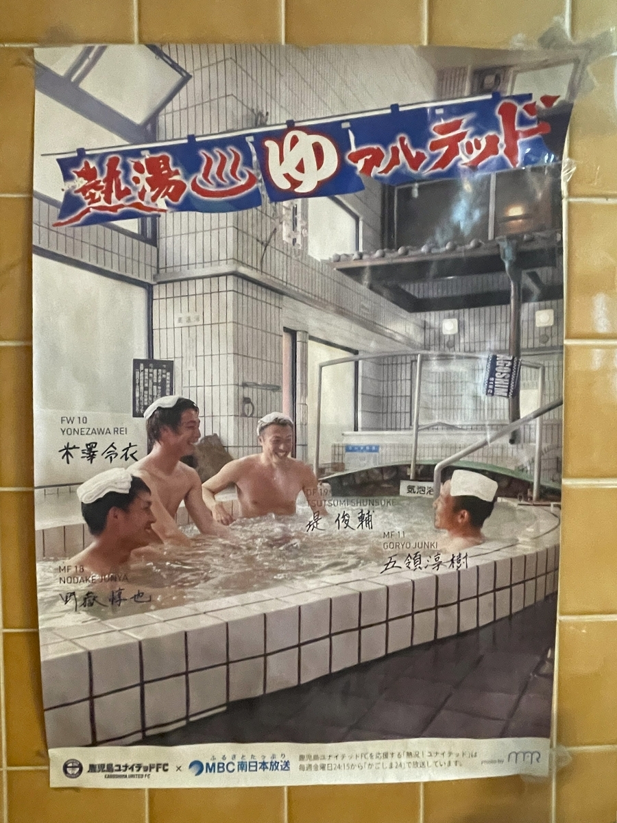 都内でも見られるポスターも多いですが、中には鹿児島銭湯ならではのものも見られます。コチラはサッカーJリーグ「鹿児島ユナイテッドFC」とのタイアップポスター。